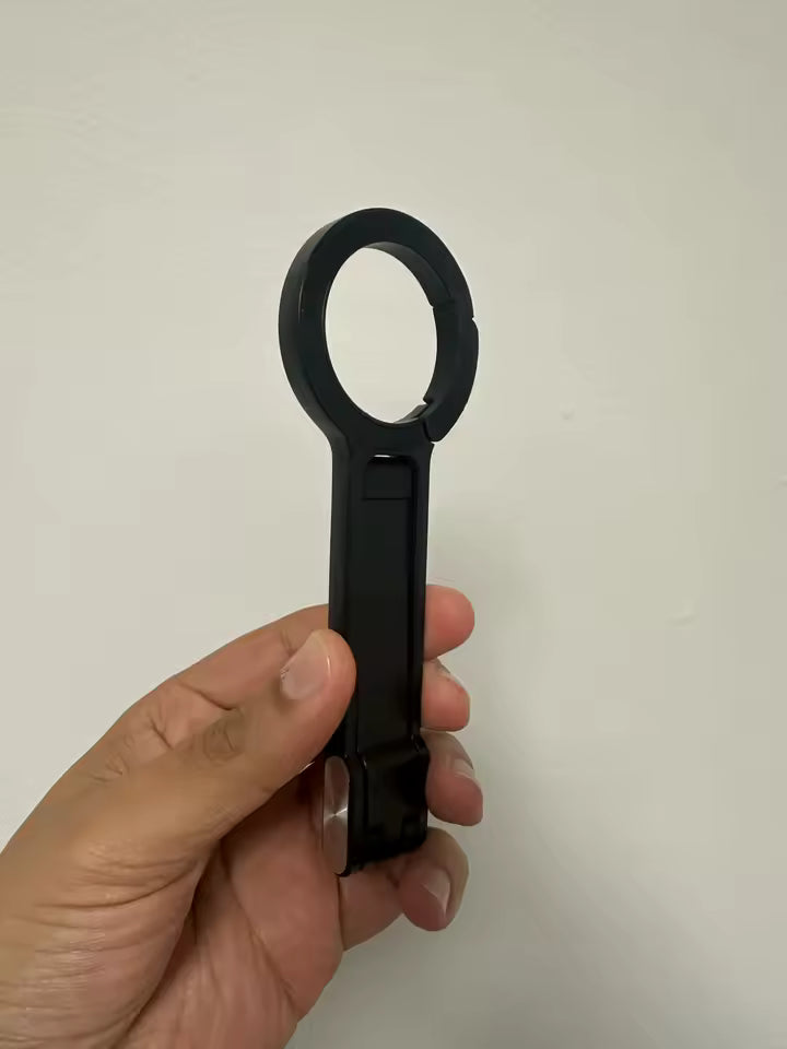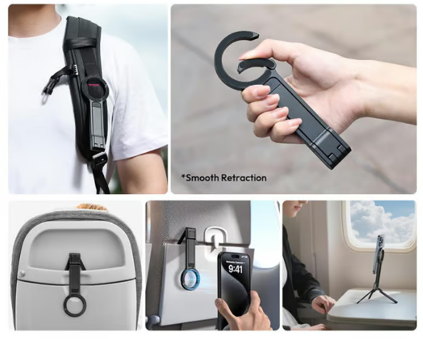 Il utilise un système de mousqueton intelligent qui s’accroche instantanément à vos sacs, ceintures ou sangles. Il se déploie ensuite pour maintenir votre smartphone de façon stable, en mode main libre ou poignée.